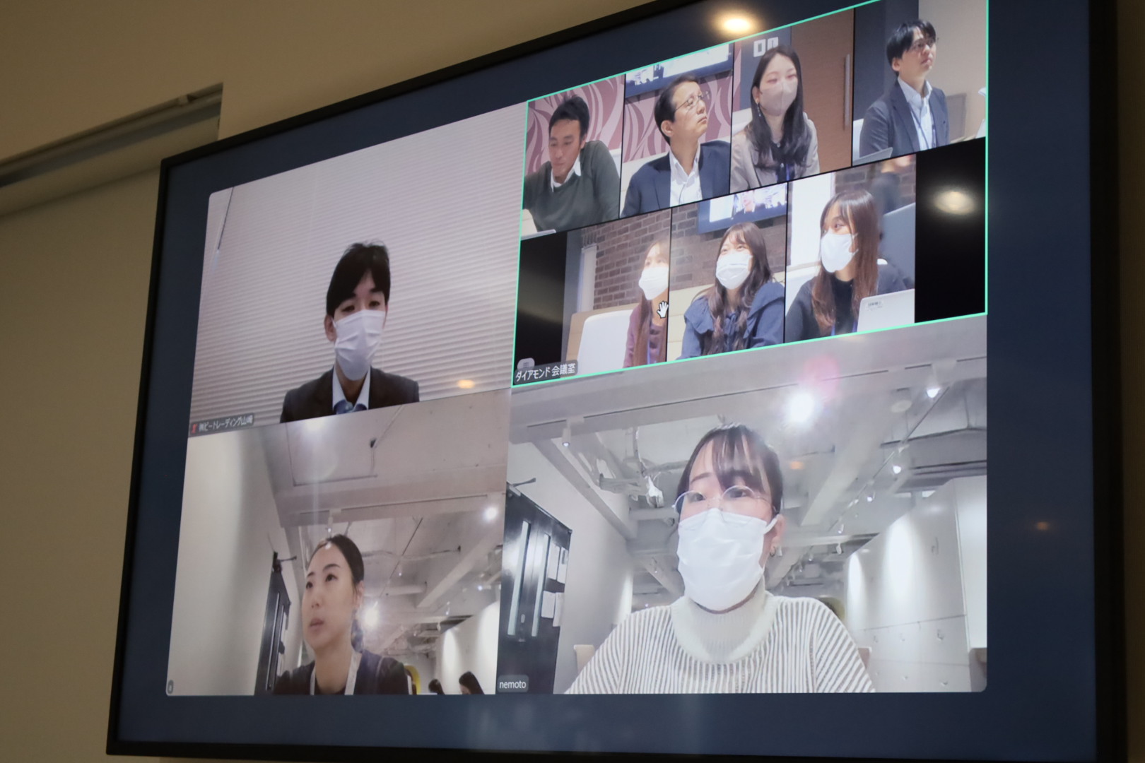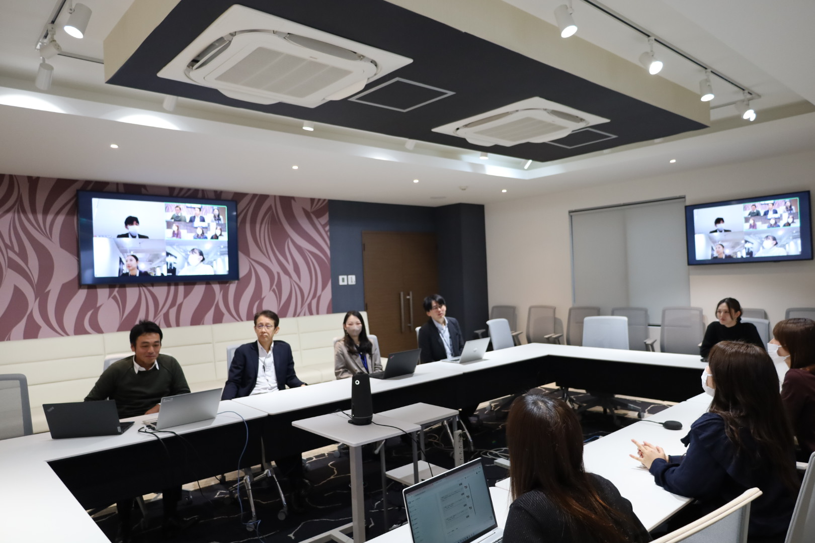 そうですね。本社のメイン会議室で全員が顔を合わせて、そこからリモート参加する人もいるというハイブリッド形式です。部屋も結構広いんですよ。